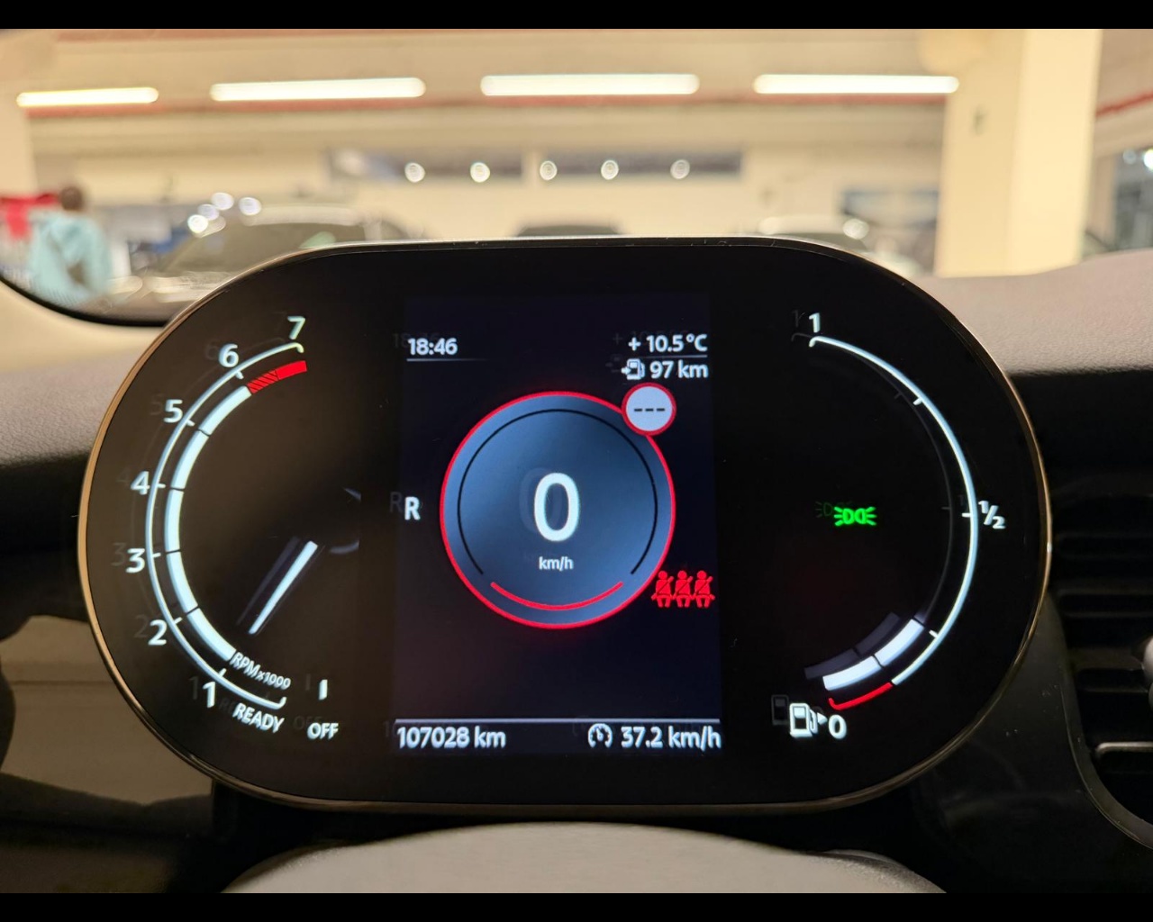 Tachimetro e contagiri dietro al volante con indicatore di temperatura esterna, velocità, ora e data