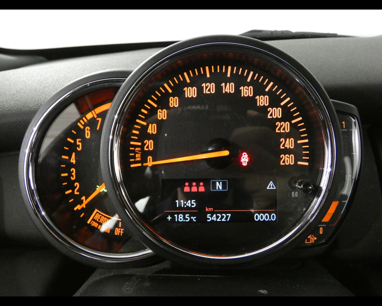 Tachimetro e contagiri dietro al volante con indicatore di temperatura esterna, velocità, ora e data